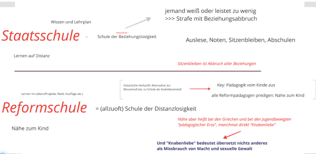 Keine Frage, Beziehung ist wichtig (erstens) und wird (zweitens) in der traditionellen Stoffschule vernachlässigt, ja, sie spielt dort praktisch keine Rolle. Aber der Rückzug allein auf Beziehung ist falsch, er führt in sehr gefährliche Sackgassen – wie etwa die Krise der Odenwaldschule zeigt, wo ein rein beziehungsorientierter Lernbegriff, der sich explizit gegen Lernen an und von Gegenständen und Disziplinen (die schönen Künste etc.) richtete, in die päderastische Katastrophe führte. Dort heißt Beziehung pädagogischer Eros oder gleich Knabenliebe.