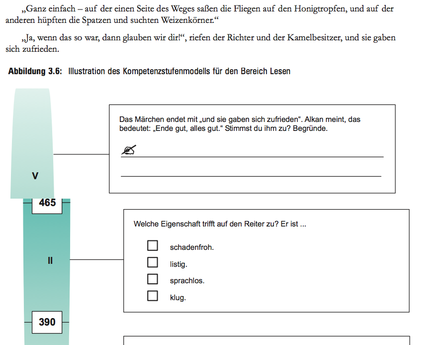 (Siehe im folgenden, wie ein Lese-Ergebnis auf Stufe V bzw. I oder II zustande kommt, am Beispiel des letzten IQB-Tests. Im ersten Teil sieht man das Ende einer kleinen Geschichte, die die Kinder zu lesen bekamen. Der 5-Sterne-Schüler kann den letzten Satz der Geschichte interpretieren; der 2-Sterne-Schüler arbeitet deskriptiv.)