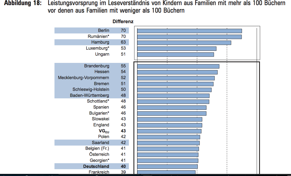 Aber wir haben bei Iglu auch andere Sachen gelernt, die nicht so witzig sind: In Berlin unterscheiden sich die Kinder aus Familien mit mehr als 100 Büchern um 70 Iglu-Punkte von den Familien unter 100 Büchern.