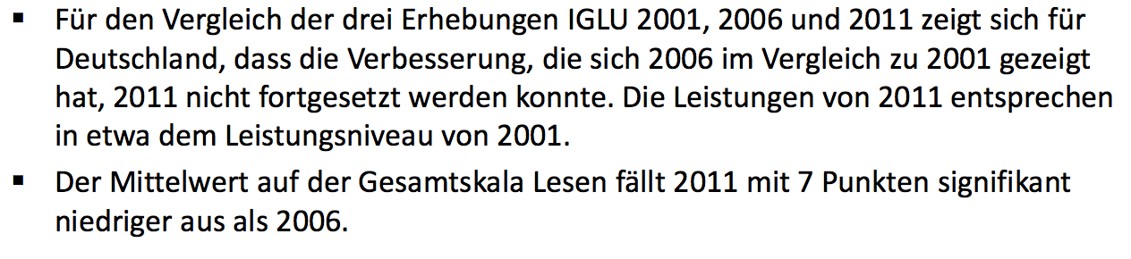Nachrichtlich: Deutschlands 10jährige halten ihre Position knapp hinter der Spitzengruppe, die Leseleistungen gehen leicht zurück (2011: 541) im Vergleich zu 2006 (548). Es gibt in Deutschlands Grundschulen nur eine geringe Zahl von Spitzenschülern (5-9,5 Prozent) und große Zahlen von Risikoschülern von 15 bis 22 Prozent.