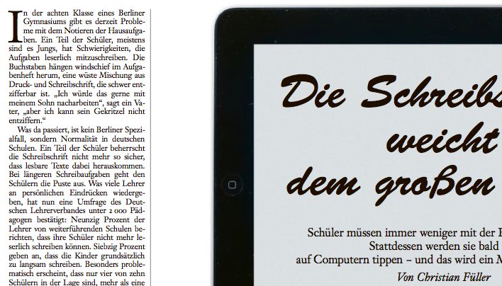 , als sie es tun. ich belasse es mal bei diesem kurzen hinweis, sie sollten sich die einschlägigen studien einfach ansehen. es lohnt sich.auf einem tablet kann man übrigens nicht schreibschrift schreiben und auch nicht lernen; man kann auch nicht mal so eben bleistift und papier wieder in die hand nehmen. haben sie sich einmal die schreibformate von kindern angesehen, die nicht schreiben gelernt haben? wie kommen sie auf die idee, dass diese nicht-schrift-anwender sich plötzlich wieder der schrift zuwenden? man kann mit einem fußball auch nach jahren ein bisschen herumbollern – aber schreiben mit einem füller, wenn man es nicht gelernt hat?