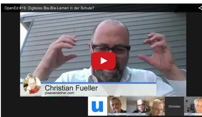 update: der hangout mit jens und martin l sowie den beiden moderatoren kann hier nachgesehen werden. martin blieb während des gesprächs eher stumm, aber inzwischen hat er nachgeliefert in einem sehr interessanten blogpost. wenn man das liest (vorsicht, sehr sehr lang und etwas unsortiert), dann weiß man, woher martins große enttäuschung kommt. er ist ein in der wolle gefärbter anhänger des freien, demokratischen netzes - und er bezieht dieses web und seine eigenarten direkt auf das lernen: hier ein kurzer einschub zu martin l, dessen beitrag im rahmen der blogparade von christian ebel erschien; siehe auch hier mein stück auf pisaversteher.