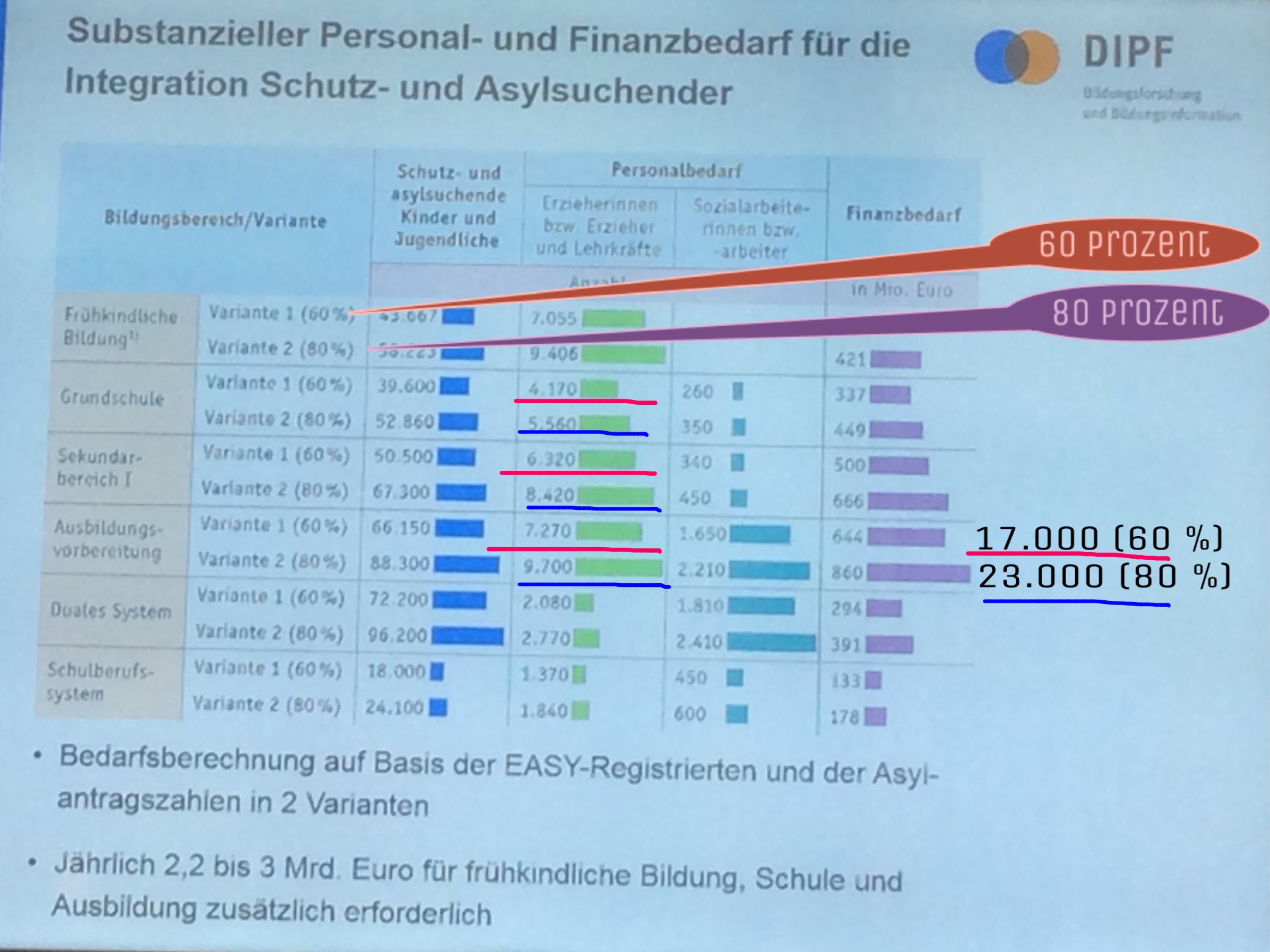 So rechneten die Forscher für die Schulminister: Wenn es nur 80 Prozent der angenommenen Flüchtlingszahlen sind, deren Kinder wirklich in die Schulen kommen, dann müssen sie über 23.000 Lehrer einstellen; wenn es 60 Prozent sind, dann wären es nur ca. 17.000 Lehrer. (Foto oben) Und danach zerbrachen sich die Forscher am Mittwoch mehrere Stunden den Kopf darüber, wie man mit geflüchteten Kindern am besten lernt, damit sie schnell Deutsch beherrschen.