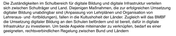 Update 9.10. 15:30 Uhr: Hamburgs Schulsenator Ties Rabe war richtig beleidigt: Gutes Zeichen, liess er erklären. Aber „die SPD hat 9 Mrd. Euro für den Ausbau der digitalen Bildung angekündigt… Wir erwarten, dass nach vielen Ankündigungen jetzt auch konkrete Finanzplanungen erfolgen, damit nicht am Ende heiße Luft übrig bleibt.“ Bei der Gelegenheit enttarnte er sich als Sprecher der rot-grün Kultusminister. Das ist ja echt Wahlkampf! (Siehe auch update 18 Uhr unten)