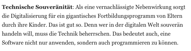 Gabriel schrieb schon am Tag zuvor über Mündigkeit in der Welt – ausgerechnet am Beispiel des Datenschutzes. Der nämlich lasse sich am besten durch Souveränität bewerkstelligen: „Das digitale Pendant [zur Privatsphäre in der physikalischen Welt] muss man aktiv schützen, indem man die Notwendigkeit und Fähigkeit zur individuellen digitalen Kompetenz vermittelt.“ Das bedeutet: das Individuum kann sich am besten selbst schützen. Wie das geht? Ein Beispiel nannte Gabriel in seinem Text: Kinder erklären ihren Eltern, wie die Technik funktioniert. Kein Witz. Das ist für Gabriel eine von „vier Disziplinen der digitalen Bildung“: