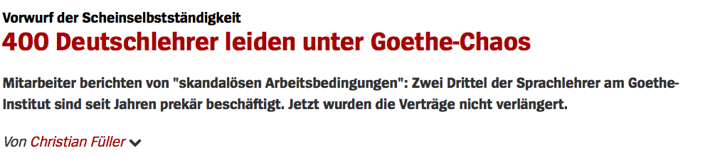 Die Goethe-Honorarkräfte kämpfen schon länger um gesicherte und sozialverträgliche Anstellungen. Wer wissen will, wie es den Leuten bei Goethe geht, der mag sich diesen Ausriss eines empörten Mitarbeiters über mein Stück bei Spiegel-Online nachlesen. Die Leute sind verzweifelt und wütend.