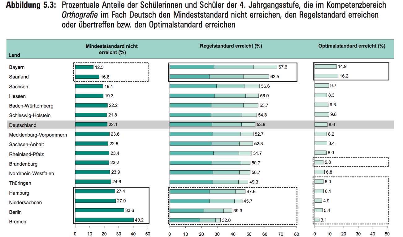Danke, das stimmt. Die Auswertung des IQB vom Oktober 2017 bezog sich genau auf eine – wenn man so will – Vera4-Studie, also Viertklässler. Dabei schneiden die Viertklässler beim Rechtschreiben deutlich besser ab: nur noch 53% sind unter oder gerade auf dem Mindeststandard. Es war Absicht, die Vera-Test schon in der dritten Klasse zu machen – damit die Schulen und Lehrer gezielt nacharbeiten können, was fehlt. So sagte es mir ein Forscher des IQB.