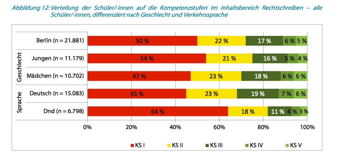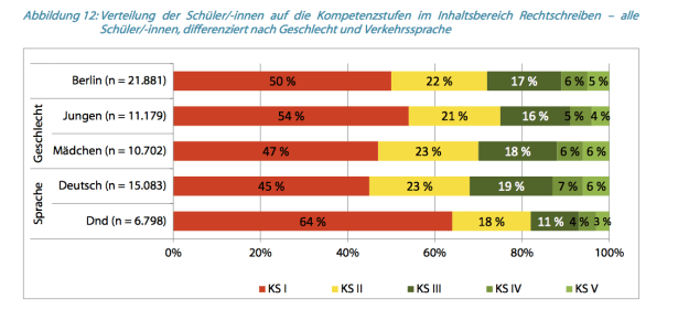 Das Maß an Fehlleistung übertrifft alle Erwartungen. Drei Viertel der Grundschüler Berlins sind nicht schreibfähig. Bei den Kindern mit Migrationshintergrund sind es gar 83 Prozent, die jenen Bereich verfehlen, der ihnen die Möglichkeit gibt, selbständig mit Texten umzugehen. Beim Lesen ist es besser, ein bisschen. Da verfehlen „nur“ 51 Prozent die Zielmarke. Aber beim Lesen gibt es wenigstens eine respektable Zahl von Kindern, die in der Spitzengruppe landen – immerhin 18 Prozent, in Orthografie sind es nur vier Prozent. Die Ergebnisse haben sich übrigens, betrachtet man die Ergebnisse in einer Zeitreihe, seit 2014 verschlechtert. Damals wurde die Kategorie Rechtschreiben bei Vera eingeführt und 72 Prozent der Drittklässler liefen unter der Hürde Mindeststandard durch oder schrammten so gerade drüber.