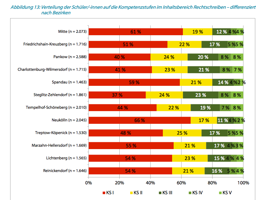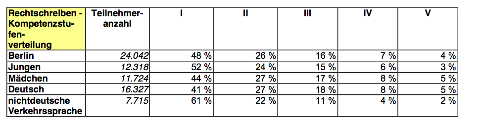 – wie jeder andere Veratest auch, bezieht sich der Rechtschreibtest, der im Mai 2017 geschrieben wurde, auf Kompetenzen, die Kinder Ende Klasse 4, also im Juni 2018 erreicht haben müssten. Es besteht also keine zwingende Notwendigkeit, dass alle Kinder die Kompetenzniveaus 3-5 erreicht haben müssen. Die hohe Zahl der Kinder auf Kompetenzniveau I allerdings ist eine Katastrophe. Die dort festgeschriebenen Kompetenzen hätten eigentlich bereits in Klasse 1 und 2 gefestigt sein müssen.