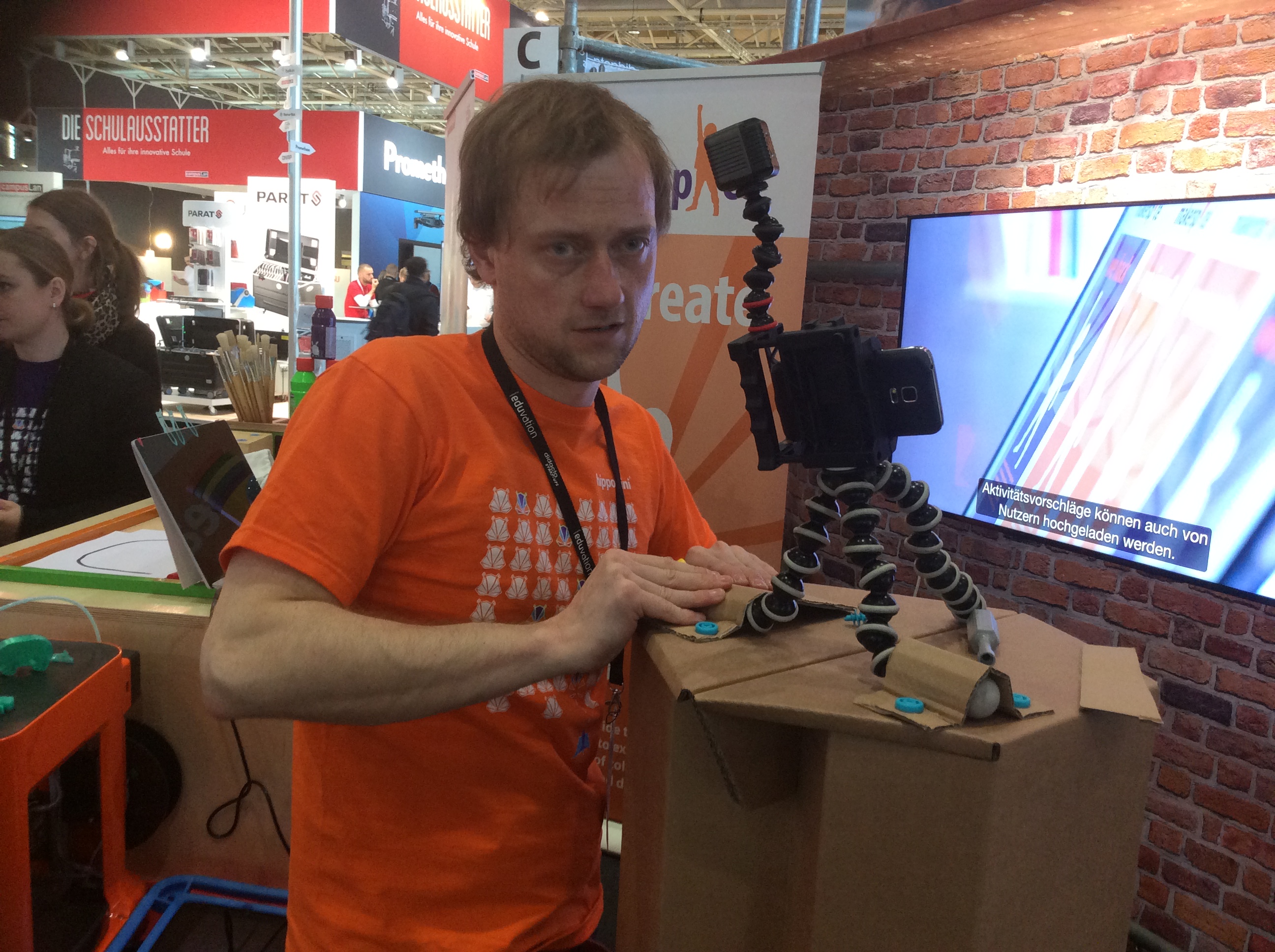 Das WLan auf der Bildungs-Messe Didacta ist sündhaft teuer. Trotzdem ist es nicht zuverlässig genug, um damit ein Podium ins Netz streamen zu können. Also musste jemand für das erste DigiQuartett ein Kamerastativ bauen, damit man das Gespräch über den digitalen Kulturwandel der Schule wenigstens für ein Youtube-Video aufnehmen konnte. Daraus wurde ein kleines Wunder auf der größten Bildungsmesse der Welt. Denn der Erzieher und Programmierer Mark Bo von Hippomini bastelte in einer Stunde aus Karton und Plasteschrauben, Pinseln und Farben eine stabile Kamerahalterung – und bestückte sie mit einem leistungsfähigen Mikro, einem Smartphone usw. Bo hätte die Gerätschaft auch so programmieren können, dass sie vor den DiskutantInnen hin und her fährt. Der Kamera-Roboter hätte sich sogar in einen Talk-Roboter verwandeln lassen – der die Debatte kommentiert.