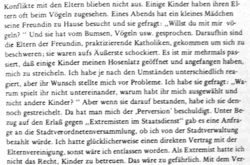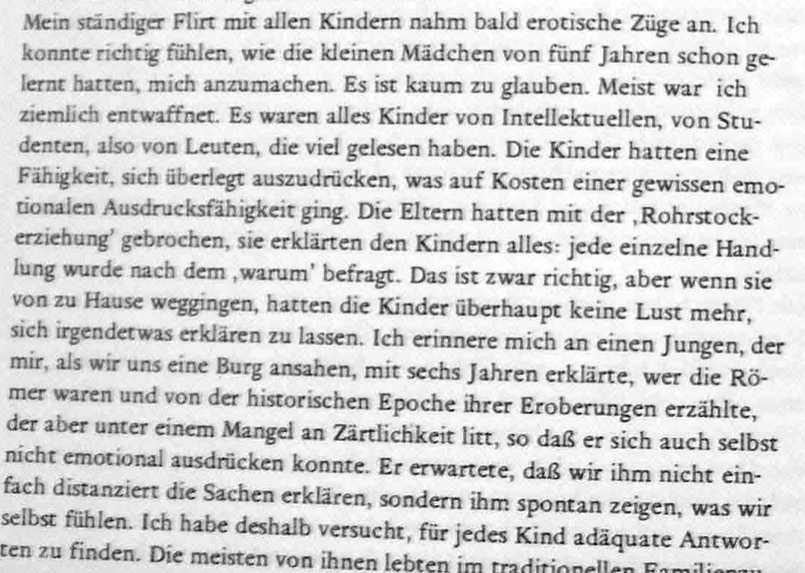 Hentig zitiert in dem Buch (es erschien ernsthaft in einem Verlag namens „Was mit Kindern“) zum Beispiel aus Briefwechseln eines damals 15jährigen Missbrauchsopfers mit Rektor Becker. Der mächtige Schulleiter, ein Freund Richard von Weizsäckers, ein Mann, der immer wieder in Radio und Fernsehen auftrat, korrespondiert mit dem Schüler, dass es dem Leser die Sprache verschlägt. Ob er wirklich glaube, fragt Becker, „dass ich irgendetwas tun könnte in dem Bewusstsein, Dir damit zu schaden?“ Es folgt ein langes Abwägen, denn der Junge hatte dem Schulleiter abgesagt. Und dann diese Sätze des pädophilen Mannes: es gebe immer wieder Gelegenheiten, wo er zwar zunächst das Nein respektiere, aber die Hoffnung nicht aufgebe, dass der Schüler doch ja sage: „zum Beispiel, weil ich fest davon überzeugt bin, dass etwas, was Du jetzt vielleicht nicht willst, letztlich gut für Dich sein wird oder Dich glücklich machen wird.“