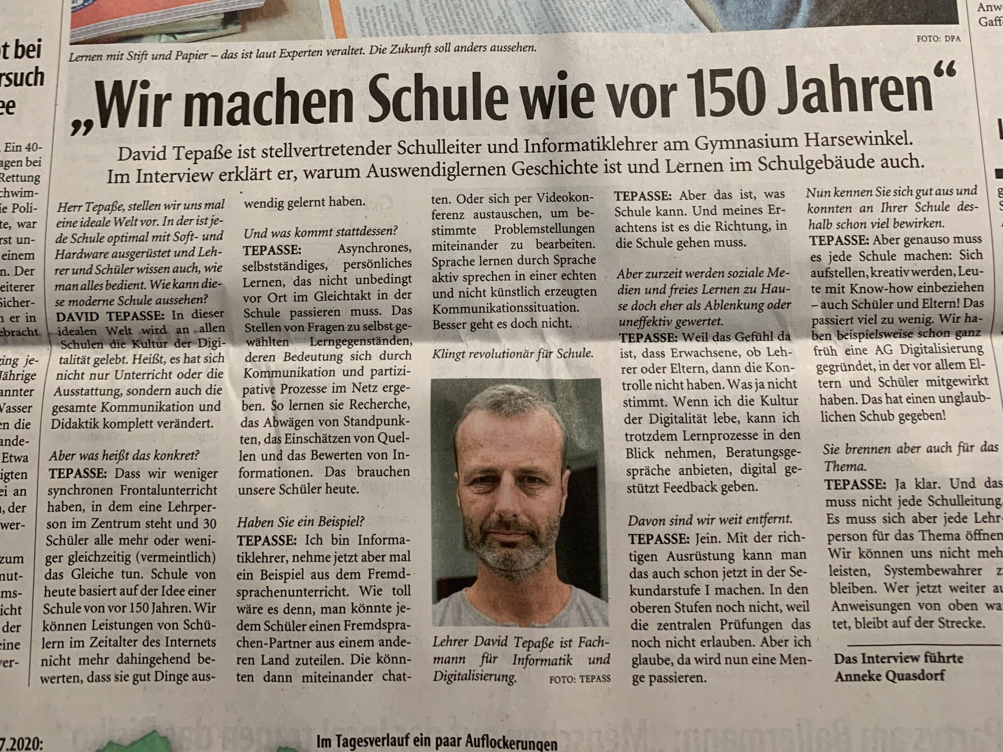 Seltsam. Wer das Interview in Gänze liest, wird feststellen: David Tepaße illustriert einerseits und bringt andererseits exzellent auf den Punkt, was Schule neu machen muss, wenn sie nicht untergehen will. Tepaße klingt kein bisschen frustriert: „Schule kann das!“ Auch wenn er weiß, dass die Zeit reif ist, überreif. „Wir können uns nicht mehr leisten, Systembewahrer zu bleiben“, sagt er. Sein Lernziel für Schüler im 21. Jahrhundert: „Asynchrones, selbständiges, persönliches Lernen, dass nicht unbedingt vor Ort im Gleichtakt in der Schule passieren muss.“ Kurz: Ein richtig gutes Interview.