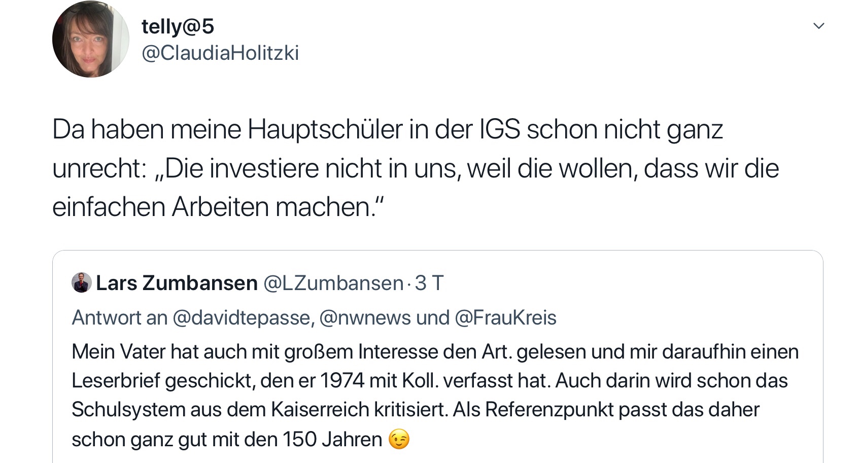 Auch Telly@5 las das Interview. Und schrieb. Ihre Hauptschüler hätten schon Recht, wenn sie sagten: „Die investieren nicht in uns, weil die wollen, dass wir die einfachen Arbeiten machen.“