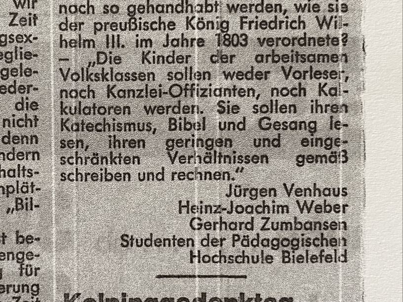 In dem Leserbrief des Herrn Zumbansen von 1974 ging die Zeitreise sogar noch weiter zurück. Bis ins Jahr 1803 – das ist jetzt über 200 Jahre her. Und trotzdem gab es Argumente der selben Art wie zu Beginn des 19. Jahrhunderts. Die Schüler sollten, so verordnete es damals Friedrich Wilhelm III., „weder Vorleser, noch Kanzlei-Offizianten, noch Kalkulatoren werden. Sie sollen ihren Katechismus, Bibel und Gesang lesen, ihren geringen und eingeschränkten Verhältnissen gemäß schreiben und rechnen.“ Da steht tatsächlich, ihren geringen Verhältnissen gemäß schreiben und rechnen.