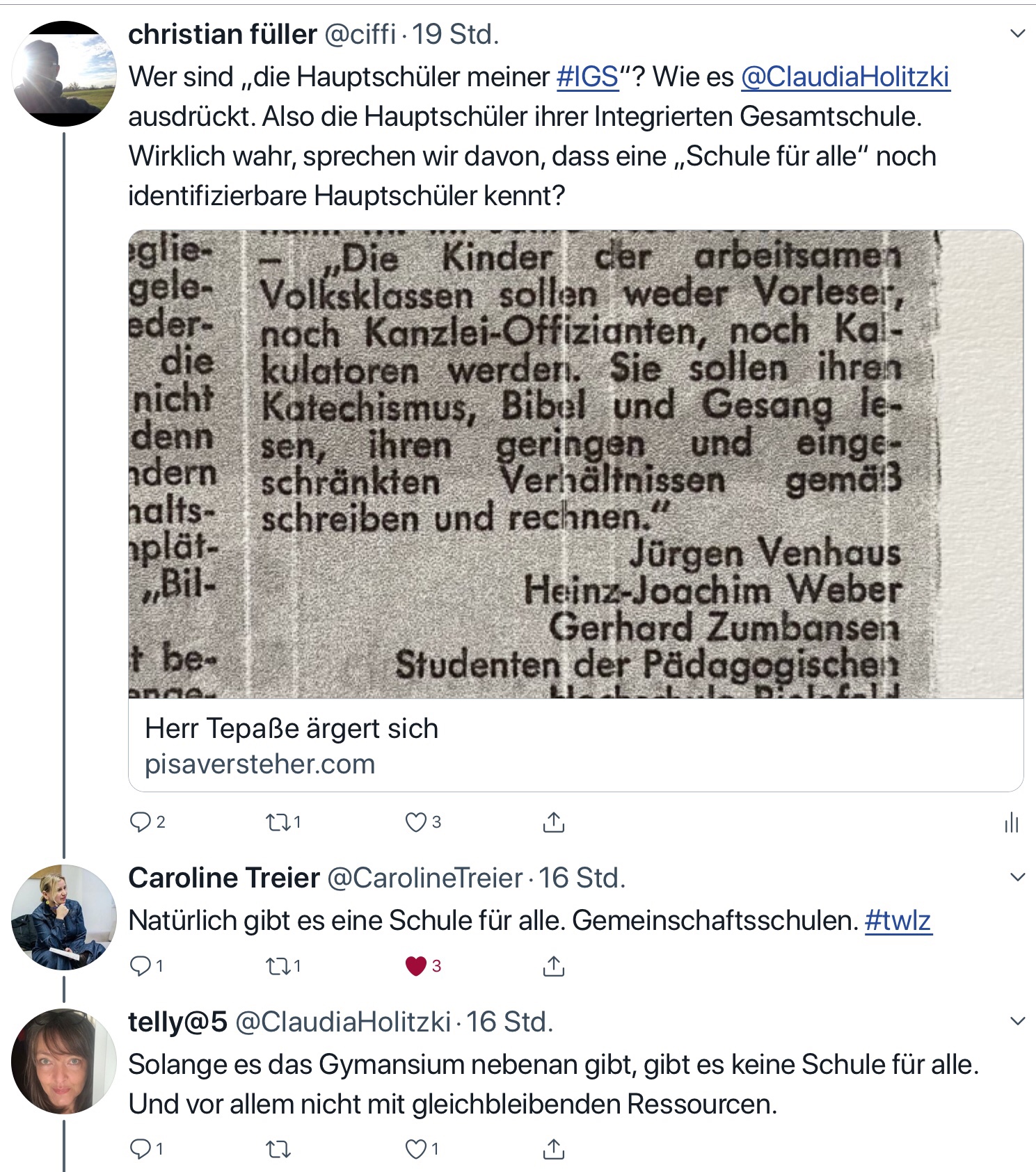 Und es verwirrt. Denn was sind „meine Hauptschüler in der IGS“, wie es Telly@5 ausdrückt? Also die Hauptschüler ihrer Integrierten Gesamtschule. Wirklich wahr, sprechen wir davon, dass eine „Schule für alle“ noch identifizierbare Hauptschüler kennt? 200 Jahre kämpfen die Zumbansens und die Tepasses und ihre Vorgänger darum, das Teufelszeug gegliederte Schule abzuschaffen – und wenns endlich klappt finden wir in den Köpfen mancher Lehrer*innen immer noch Hauptschüler?
