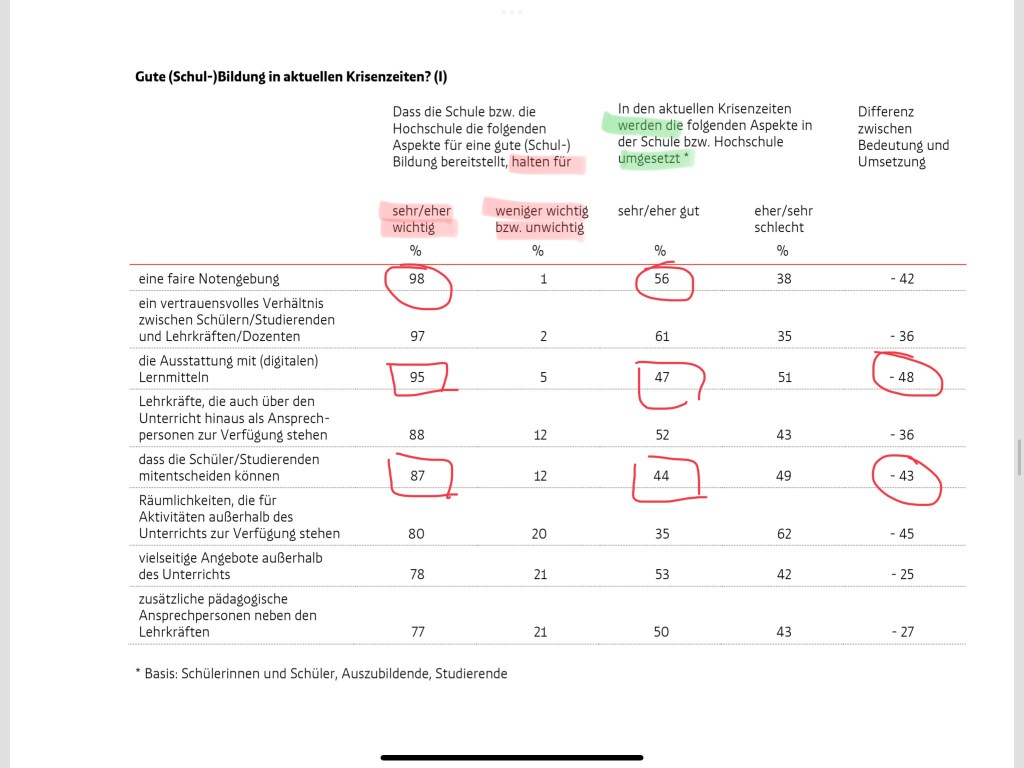 Eine große Mehrheit von Schülerinnen und Schülern ist der Ansicht, dass digitale Lernangebote in die Schule gehören. 95 Prozent der befragten SchülerInnen finden die Ausstattung mit digitalen Lernmitteln der Schulen wichtig oder sogar sehr wichtig. Bemerkenswert an dem Befund ist zugleich, dass hier der Anspruch der SchülerInnen und die Wirklichkeit in den Schulen weit auseinander liegen. Nur 47 Prozent der Befragten sind der Ansicht, dass die gute digitale Ausstattung der Schulen in aktuellen Krisenzeiten auch wirklich bereitgestellt wird. In keinem anderen Feld ist die Differenz so groß zwischen dem, was die SchülerInnen sich wünschen, und dem, was die Realität bietet.
