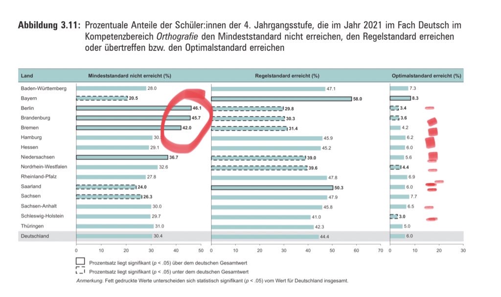 In den Bundesländern Berlin, Brandenburg und Bremen schaffen über 40 Prozent der ViertklässlerInnen die Mindeststandards in Orthographie nicht. Das bedeutet, dass Schule ihren originären Auftrag verfehlt: Kindern das Schreiben beizubringen. Lesen, Schreiben und Rechnen – das sind nunmal die Kulturtechniken, um an einer (modernen) Gesellschaft teilhaben zu können. Schule wurde gegründet, um sie Kindern beizubringen. Das ist ihr Job. Ich würde dazu heute auch noch digitale Grundkenntnisse als vierte Kulturtechnik zählen. Aber warum sollen wir über digitale Souveränität sprechen, wenn wir in den genannten Bundesländern bei fast der Hälfte der Schüler Texte schlicht nicht mehr lesen können. Weil diese Kinder es nicht gelernt haben, mehr als 30 Prozent eines Textes korrekt zu artikulieren.
