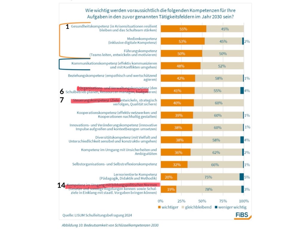 Die Ergebnisse der Kompetenzabfrage für das Jahr 2030 sind in der Tat überraschend. Die Kompetenz, „den Schulbetrieb zu planen, Ressourcen zu managen und zu budgetieren“, sehen die Schulleiter erst auf Platz 6, weit abgeschlagen hinter der Gesundheits- oder der Medienkompetenz. Auf Platz 7 folgt die Fähigkeit, für die Schule „Ziele zu entwickeln, strategisch zu verfolgen und Qualität zu sichern“. Und ganz hinten auf dem letzten Platz liegt im Wertekanon der Rektoren „die Kompetenz im Umgang mit bildungspolitischen Normen“. Dahinter verbirgt sich, „Gesetze und sonstige Regelungen zu kennen, sowie Schulziele in Einklang mit staatlichen Vorgaben bringen zu können.“ Nur ein Fünftel der Schulleiter in und um die Hauptstadt findet das im Jahr 2030 wichtig.