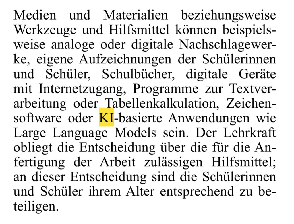 Was die Ministerin allerdings tut, ist nicht progressiv, sondern erzeugt eine Zweiklassen-Schule: KI gibt’s nicht für alle Schüler im Saarland – dafür können die wenigen Lernenden, die KI privat bezahlen können und einsetzen wollen, jetzt die Vorteile in Prüfungen daraus ziehen. Das ist einer öffentlichen Schule unwürdig. Die Prüfungen für wenige KI-Nutzer anpassen, aber die KI vielen verweigern. Im neuen Leistungsbewertungserlass (Screenshot ⬇️) sind KI-basierte Anwendungen wie LLM erlaubt – aber eben nur für die wenigen, die sie privat besitzen.