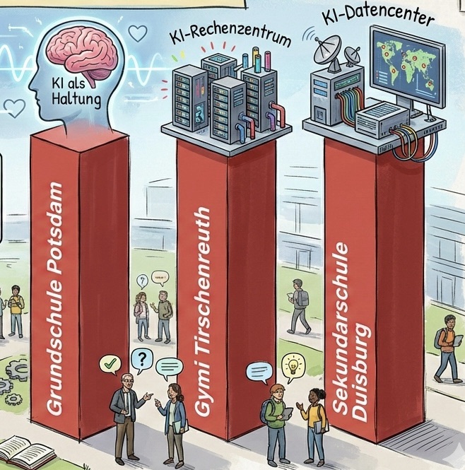 Drei Schulen werden für einzelne KI-Konzepte ausgezeichnet, das kann etwa ein Fach „Digitale Ethik“ sein oder ein KI-Assistent, den Lehrkräfte für ihre Kollegen gebaut haben. Drei weitere Schulen werden für das KI-Gesamtkonzept ausgezeichnet – und die folgenden Schulen sind meines Erachtens dafür besonders prädestiniert.