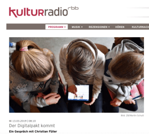 Interview im rbb-Kulturradio am 13. März 2019: An zwei Beispielen kann man zeigen, wie viel Dynamik der Digitalpakt ausgelöst hat. In Berlin-Mitte ist plötzlich eine ganz normale Lehrerfortbildung total überlaufen und in Potsdam bastelt ein Institut fröhlich eine Schulcloud zusammen – obwohl es von diesen Dingern so viele gibt. (Beitrag nicht mehr in der Mediathek)